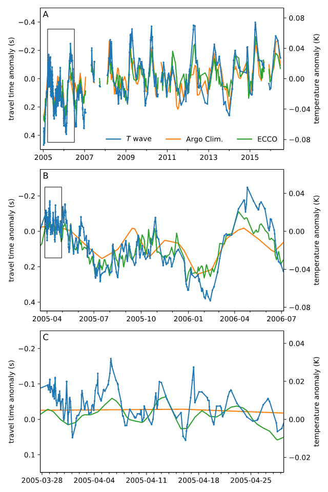 气候变化是公众及学者高度关注的问题。大气中二氧化碳等温室气体浓度的上升,导致了气候系统中热量增加(excess energy),而海洋吸收了其中90%以上的热量,因此海洋在气候变化中起到关键的作用。然而,深层海水温度实测资料严重不足,人们对于海洋深处的温度变化特征分析十分有限,这制约了科学家对长期气候变化的深入认识。针对此难题,美国加州理工学院地震学实验室博士吴文波、助理教授詹中文以及evo真人视讯大地测量与地球动力学国家重点实验室研究员倪四道三位地震学者提出了利用地震T波测量深海温度变化的新方法,在与物理海洋学家合作的基础上,取得了2005-2016年期间的赤道东印度洋深层海水温度多时间尺度的变化特征。该方法为物理海洋学及气候变化研究给予了新手段。相关研究发表在国际学术期刊《科学》(Science)上。