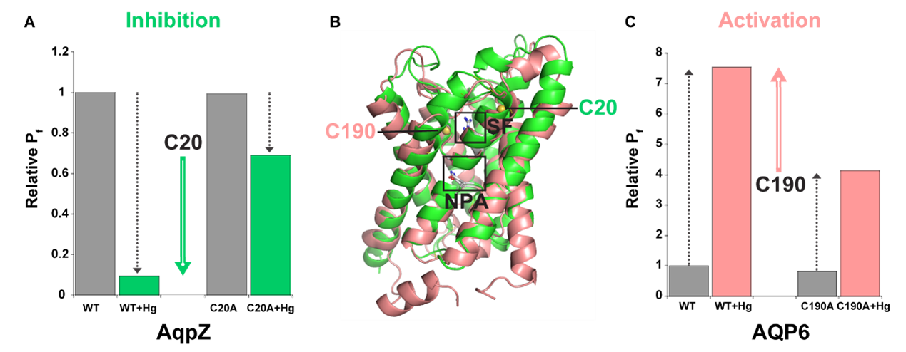 汞离子抑制AqpZ的通水速率,汞敏感位点为C20;汞离子激活AQP6的通水速率,汞敏感位点为C20;C20和C190均位于选择性过滤(SF)区域附近