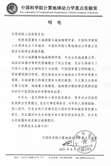 当前位置:evo真人视讯 > 专题 > 深切缅怀许厚泽院士 > 各界唁电