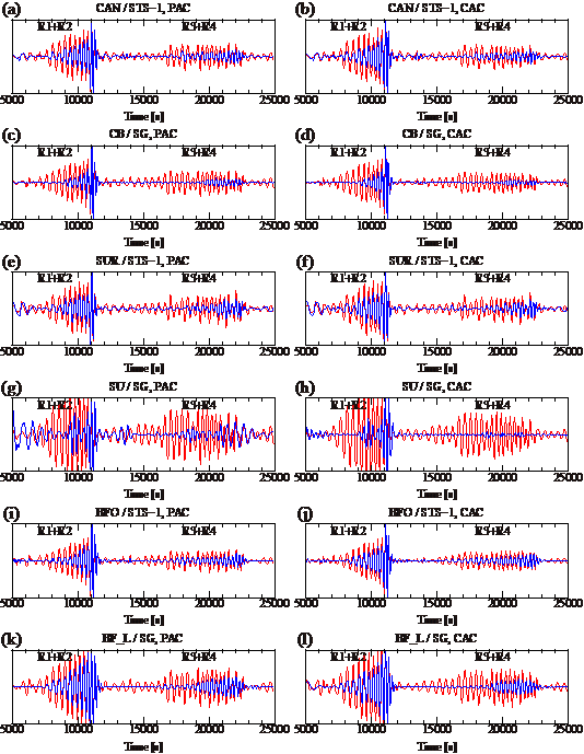 图1 不同台站超导重力仪与地震仪同址观测到的地球长周期面波信号(SG表示超导重力仪,STS-1表示地震仪;红线表示未扣除地震影响的结果,蓝线表示扣除地震影响后的结果;PAC表示相位自相关方法,CAC表示传统自相关方法;CAN和CB、SUR和SU、BFO和BF_L表示各同址观测台站)