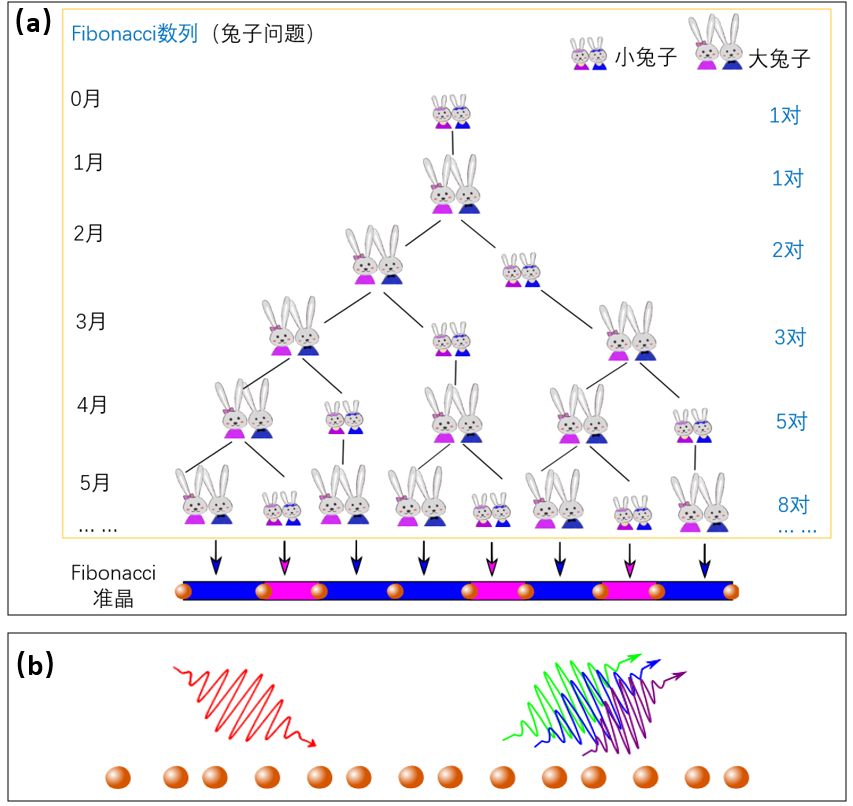 (a)Fibonacci数列(兔子问题)与Fibonacci准晶之间的关系示意图。(b)Fibonacci准晶高次谐波示意图