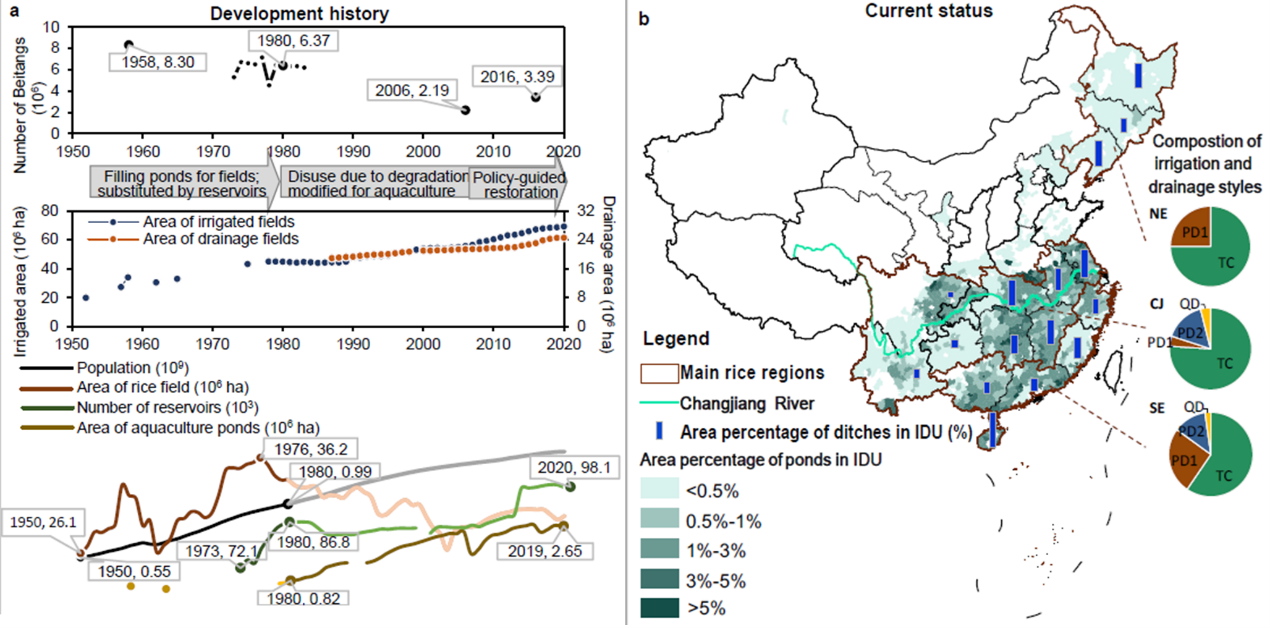 evo真人视讯杜耘、张亮团队,与中国农科院、华中农业大学、中科院重庆绿色智能研究院、加拿大滑铁卢大学及湖北、江西、辽宁省农科院等单位合作,系统调查了我国水稻灌排系统的开展历程及小水体利用现状,发现近几十年来由于填塘造田和自然损毁,我国稻区的水塘数量已大幅减少,现存水塘有的缺乏维护而淤积严重、有的改为精养渔塘,80%都不再参与水稻灌排(图1)。然而,基于前期建立的涵盖中国417个水体的数据集,团队发现相比于湖泊、水库等大型水体,小水体的氮磷截留能力更强。稻区小水体的减少和弃用,增加了水稻生产的清水消耗量和污水排放量,从而提高了水稻生产的水足迹。同时,过度依赖远距离水源的灌溉模式,也增加了稻田在干旱天气的减产风险。