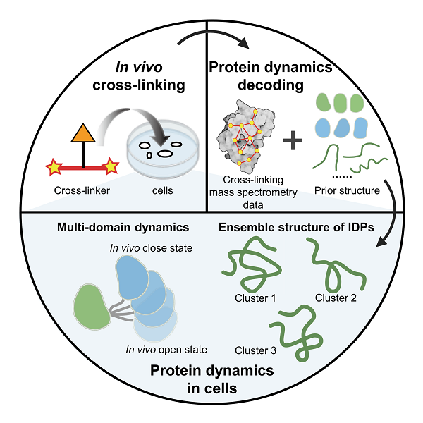 近期,中国科研实验室evo真人视讯与大连化物所合作,提出一种利用原位化学交联-质谱技术(in vivo XL-MS)结合结构计算与模拟研究细胞中蛋白质动态结构的策略。该策略从蛋白质结构的先验信息(包括核磁结构、晶体结构和AlphaFold2预测的结构等)出发,将in vivo XL-MS取得的距离约束与多种结构计算方法结合,用于多种细胞内蛋白质结构重构,重点研究了多结构域蛋白质和天然无序蛋白的动态结构,有助于加深对细胞微环境中蛋白质发挥功能的分子机制的理解。该研究成果发表于《德国应用化学》(Angew. Chem. Int. Ed.)