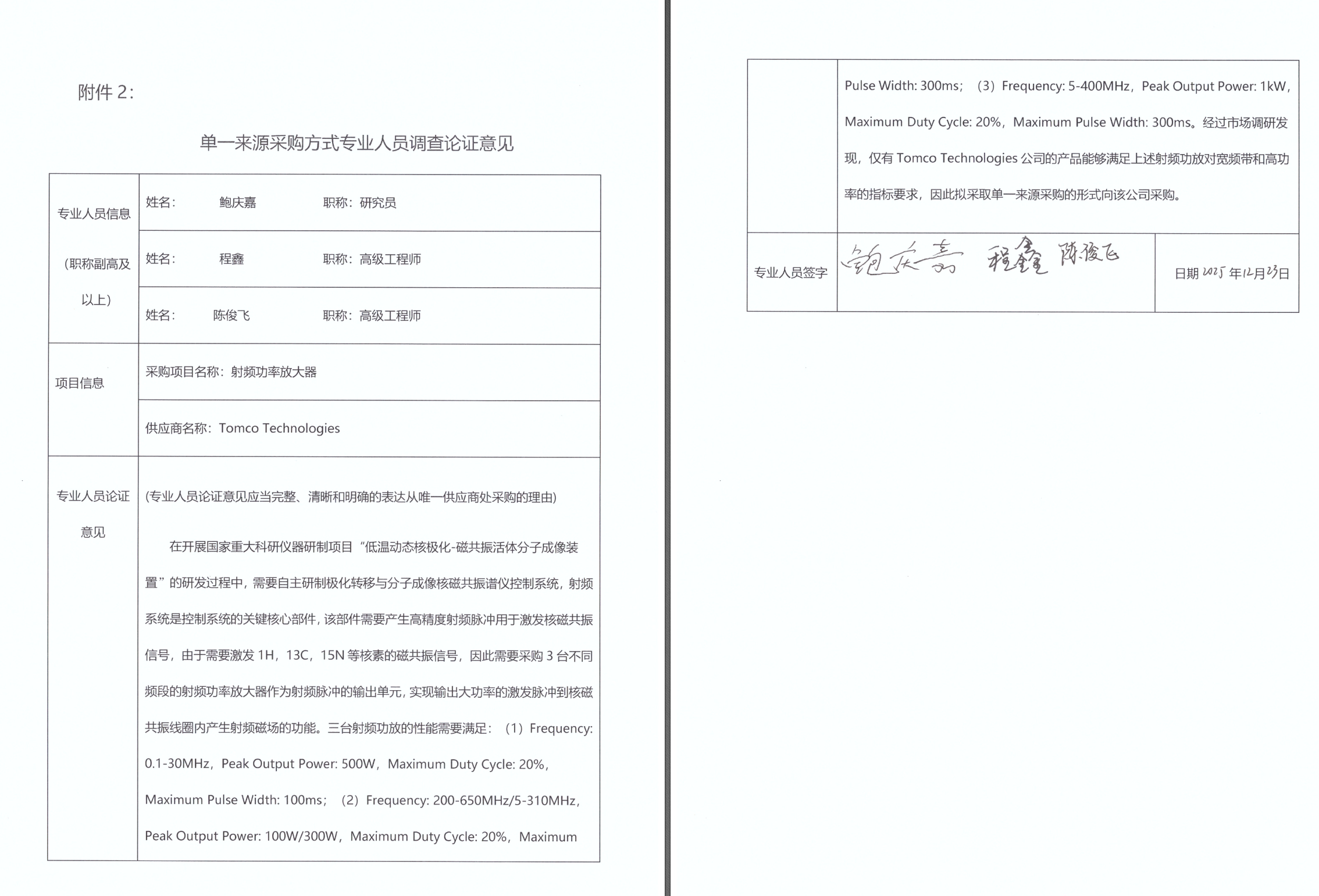 中国科研实验室精密测量科学与技术创新研究院关于向Tomco Technologies公司采购射频功率放大器单一来源采购公示